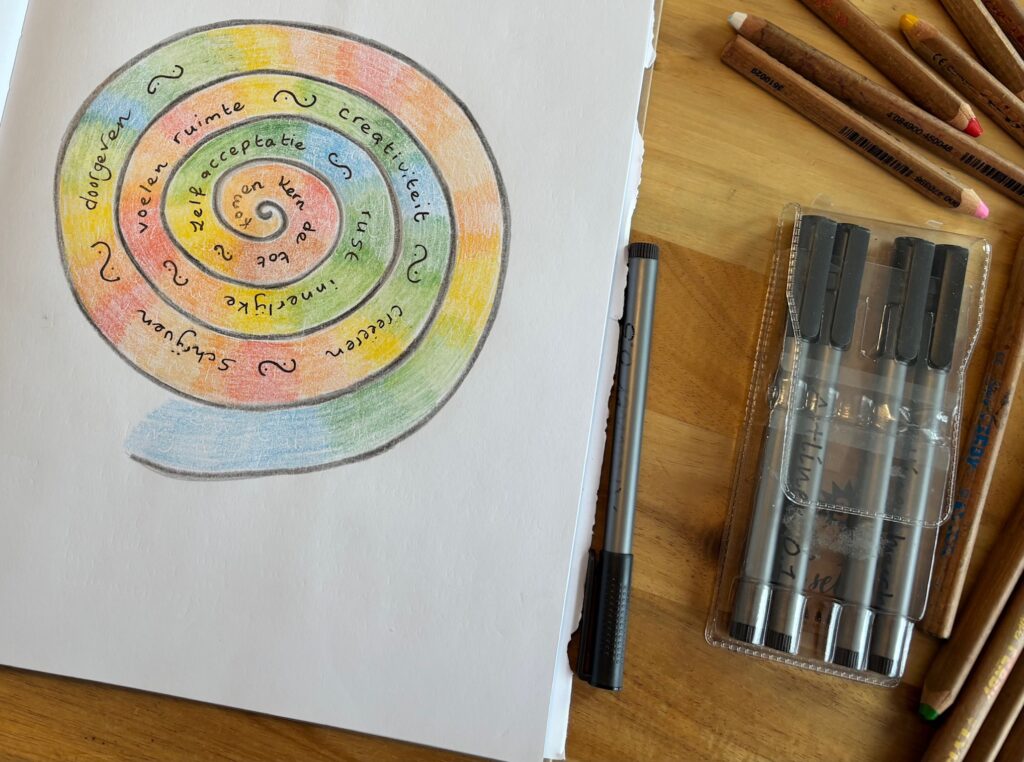 Voor mij is dit nu aan de orde omdat ik met pijn in het hart mijn leuke en ook ambitieuze baan in het hbo per augustus ga verlaten om meer ruimte te maken voor andere belangrijke dingen (zoals bijv. een nieuwe opleiding!). Door de oefening te doen, merkte ik weer even hoezeer ik ernaar uitkijk om meer ruimte en rust te ervaren. Als vanzelf ontstond het symbool van een spiraal, dat voor mij staat voor groei richting een plek waar ik echt mezelf kan zijn.